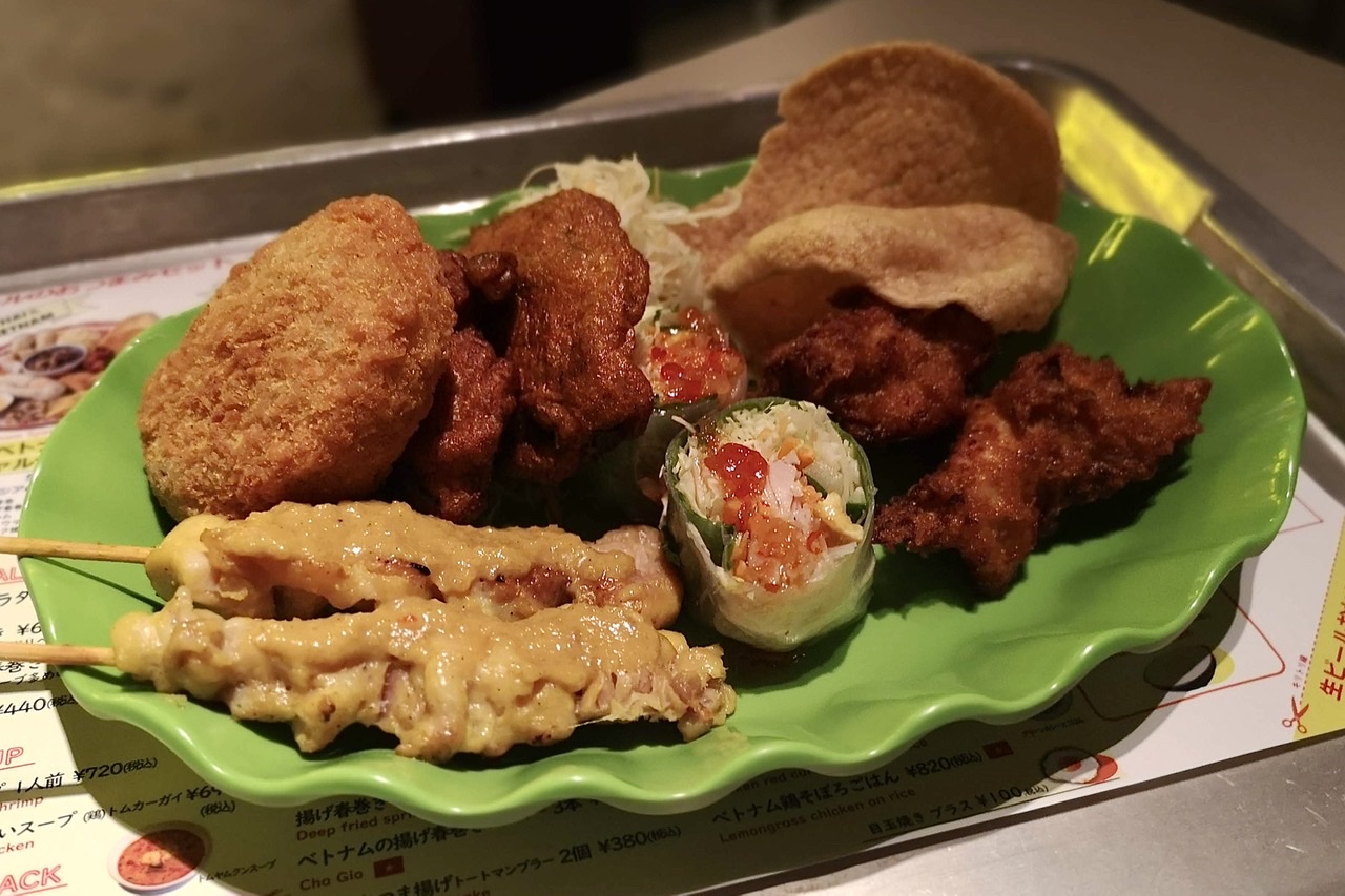 揚げ物とサテ、生春巻きと海老せんがのっており大充実。